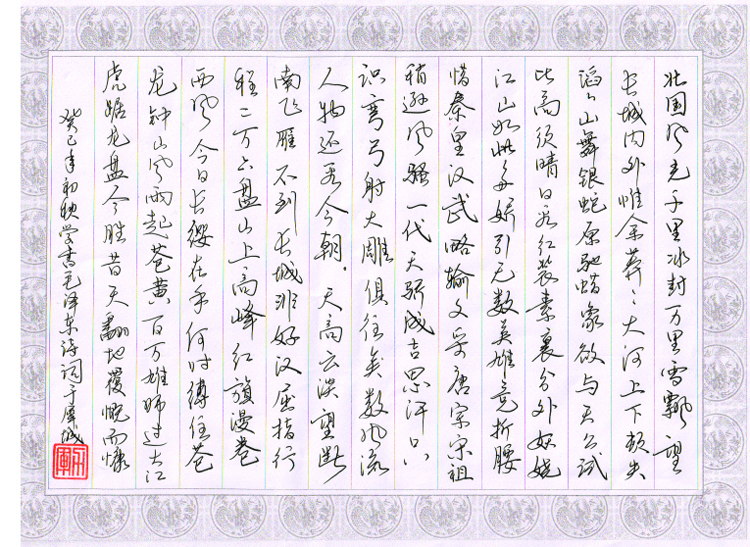 硬筆書(shū)法一等獎(jiǎng):行書(shū) 《沁園春.雪》(作者:肖力軍)